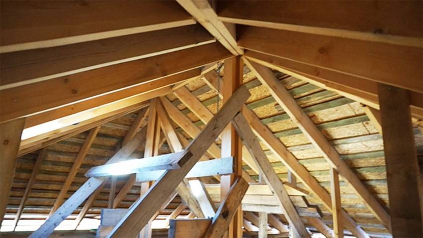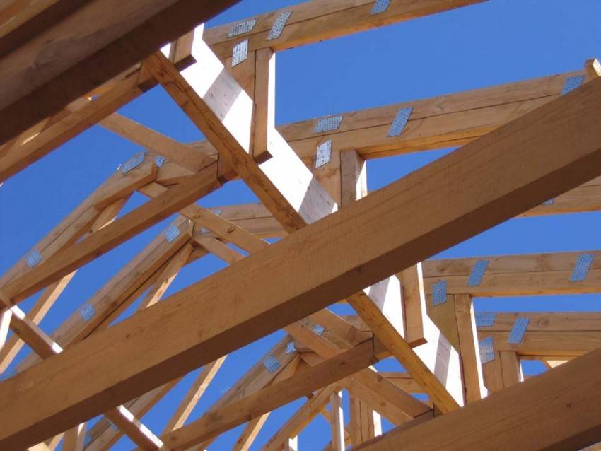 Стропильная система двухскатной крыши для большого пролета и узлы врубки конька и стропил