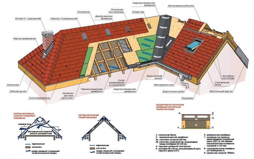 Для получения теплой крыши при подборе высоты сечения ног учитывается толщина используемого утеплительного материала. Монтаж выполняется таким образом, чтобы утеплитель не выступал из несущей балки. При этом учитывается, что при использовании минеральной ваты необходим зазор для вентиляции (примерно 2-4 см). При недостаточной высоте стропил необходимо установить контробрешетку (контррейку).