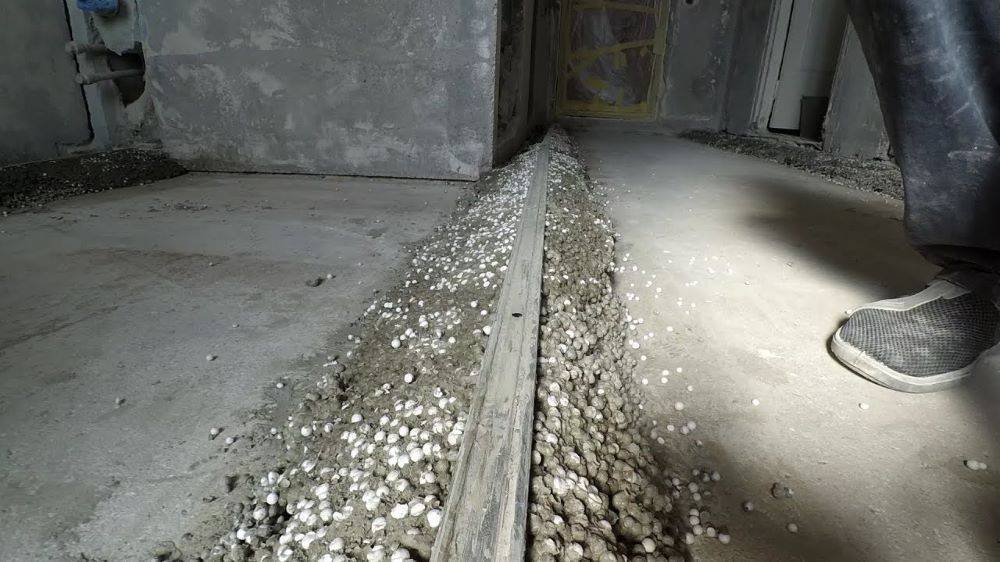 - Далее устраивают черновую стяжку. Ее можно сделать утепленной, добавив в раствор керамзит или крошку пенопласта. Кроме этого, раствор в этом случае можно замешивать не на песке, а на гравии. Стяжку выравнивают и оставляют застывать.