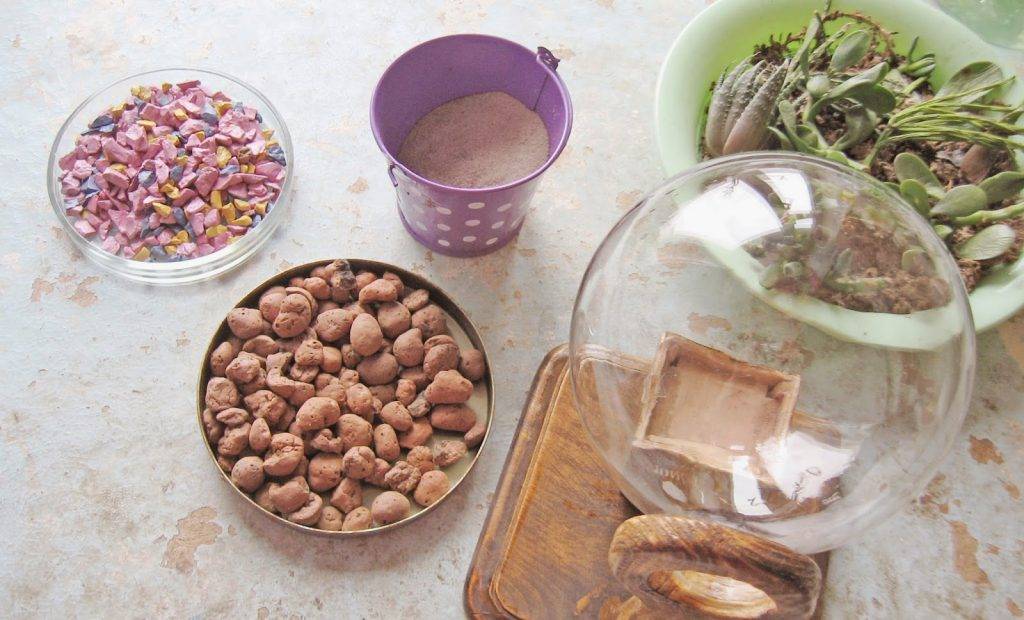 Понадобятся такие вещи: декоративная емкость (например, плетеная тарелочка), емкость для воды, камешки для украшения, песок, клей.