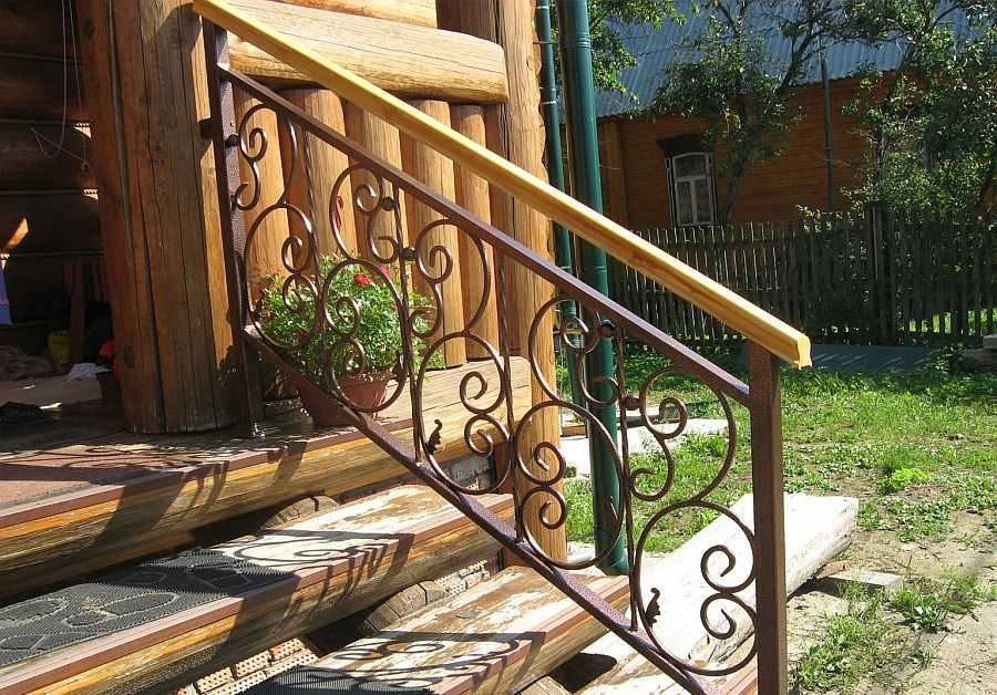 На кованную или сварную ограду обычно ставят деревянный поручень. В нижней его части делают пропил по размерам верхней перемычки готового ограждения. Глубина посадки поручня — около 2 см. Можно и больше-меньше — зависит от желания. Соединяют перила с поручнем саморезами, которые закручиваются через отверстия в верхней перемычке