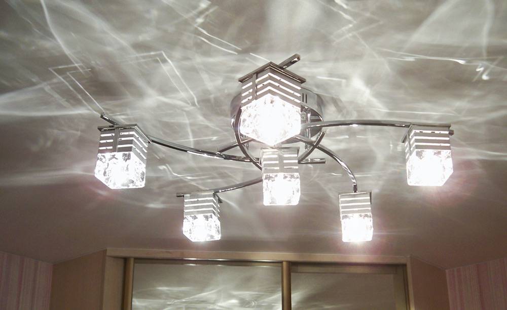 Вывод таков – люстра не должна нагревать потолок. Для освещения используют энергосберегающие или светодиодные лампы, а сама люстра размещается таким образом, чтобы не деформировать тонкую поверхность пленки.
