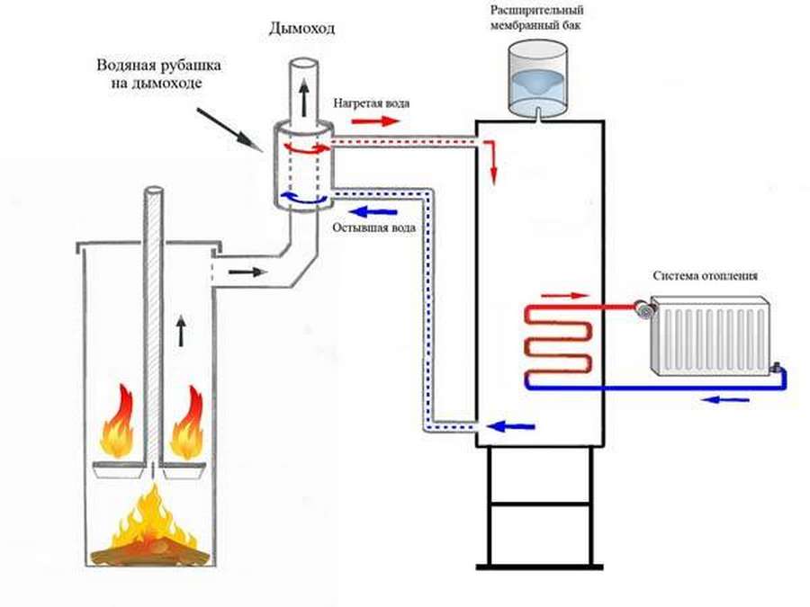 Принцип работы такой системы отопления известен многим сельским жителям. Внутри печи в зоне, близкой к горящему топливу, монтируется сваренный из толстостенных металлических труб коллектор, в котором происходит нагревание воды. По закону физики горячая вода поднимается наверх, по специально оборудованной трубе. Далее она попадает в трубопровод отопления, который расположен с небольшим уклоном, который сохраняется на всем его протяжении. По тем же физическим законам жидкость течет вниз, проходит по всей системе, отдает тепло, в конце концов, попадая обратно в коллектор внутри печи, где круг возобновляется.