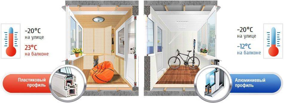 Термин «тёплый алюминиевый профиль» обозначает наличие вставки из полиамида посередине конструкции из алюминия. В холодном профиле отсутствует теплоудерживающий слой. Для данного способа утепления холодный балконный фасад заменяют на алюминиевый оконный профиль, в середине которого встроены элементы из пластика. При этом требуется 2-е или 3-е остекление. Этот вид станет оптимальным решением для южных широт и не подойдёт для северных регионов.