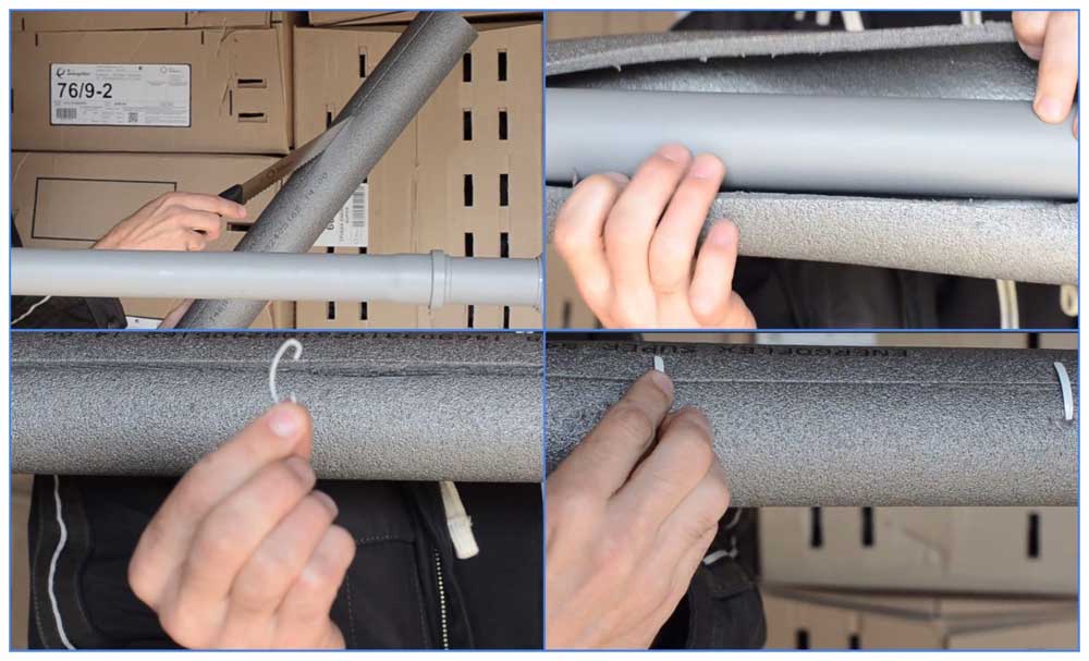 - Утеплитель разрезают вдоль и оборачивают вокруг трубы. Одновременно с этим нужно контролировать совпадение швов между утеплителем и провод, что не даст холоду попасть внутрь.