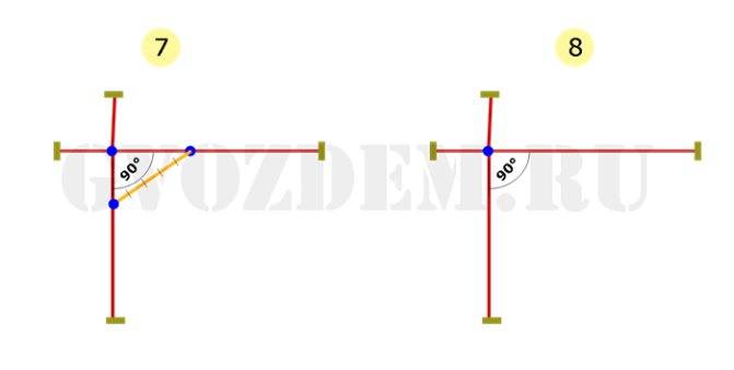 2. Натягиваем вторую бечевку максимально перпендикулярно первой. Идеально перпендикулярно на практике натянуть сложно, поэтому на рисунке мы также отобразили ее не много отклоненной.