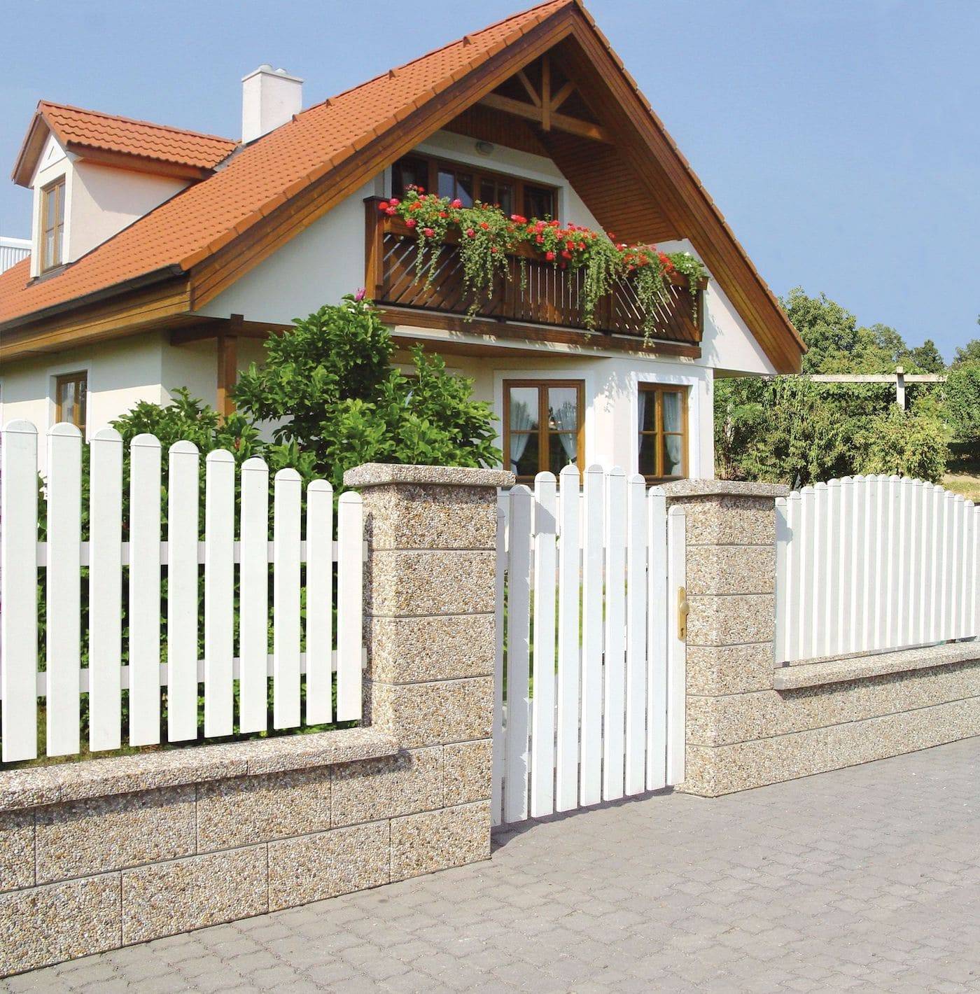 Классический тип, штакетник, может располагаться как по вертикали, так и по горизонтали. Его основание делается из кирпича либо каменного фундамента. Можно использовать и опорные столбы для монтажа ограждения. Но ограду стоит покрасить для защиты от влаги.