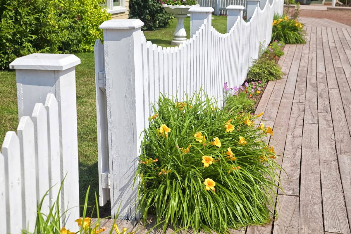 Штакетник – это самый востребованный тип среди дачников. Высота и ширина штакетин подбирается индивидуально. Они крепятся к деревянному каркасу при помощи саморезов. Если их располагать плотно друг к другу, то территория будет защищена от пыли и посторонних взглядов. Этот тип часто выбирают для установки калитки.