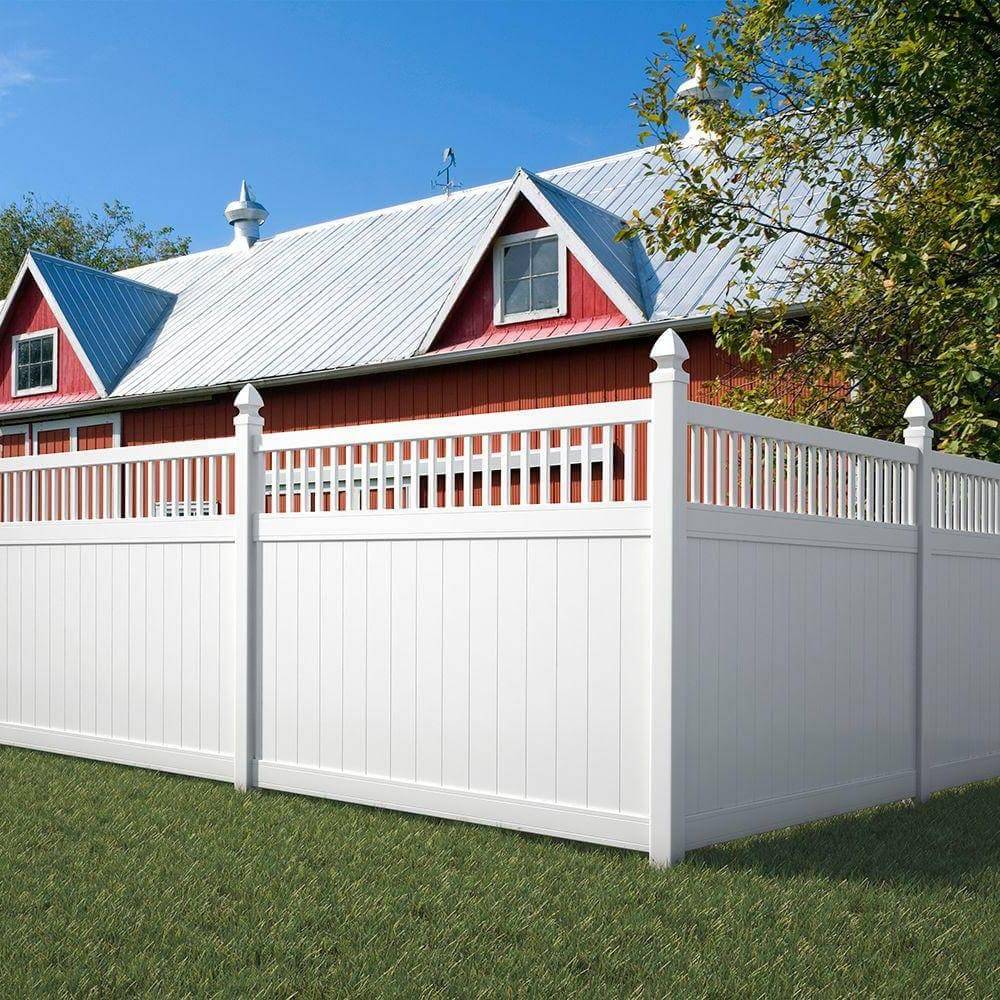 Плюс ограды – она даже после длительного срока эксплуатации не выгорит на солнце. Есть возможность выбрать любой дизайн. Но этот вариант не устойчив к механическим воздействиям и сильному ветру. У него непродолжительный эксплуатационный срок – всего 10–15 лет. Образец – на фото выше.