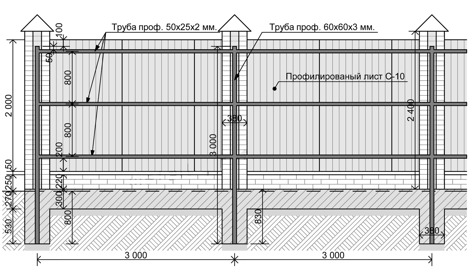 Если выбор остановлен на профильных трубах, то их толщина должна быть 3-4 мм. Трубы устанавливаются в яму. Глубина ямы зависит от типа грунта.