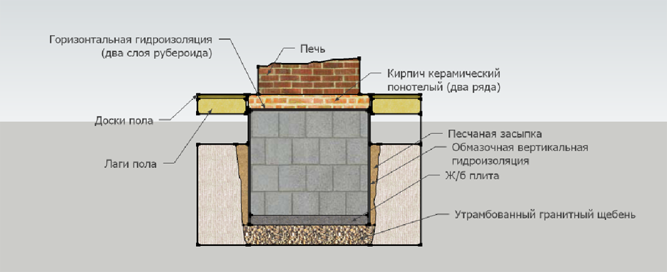 Стандартная схема кладки кирпичного камина включает в себя такие элементы (двигаясь снизу вверх, как идет кладка):