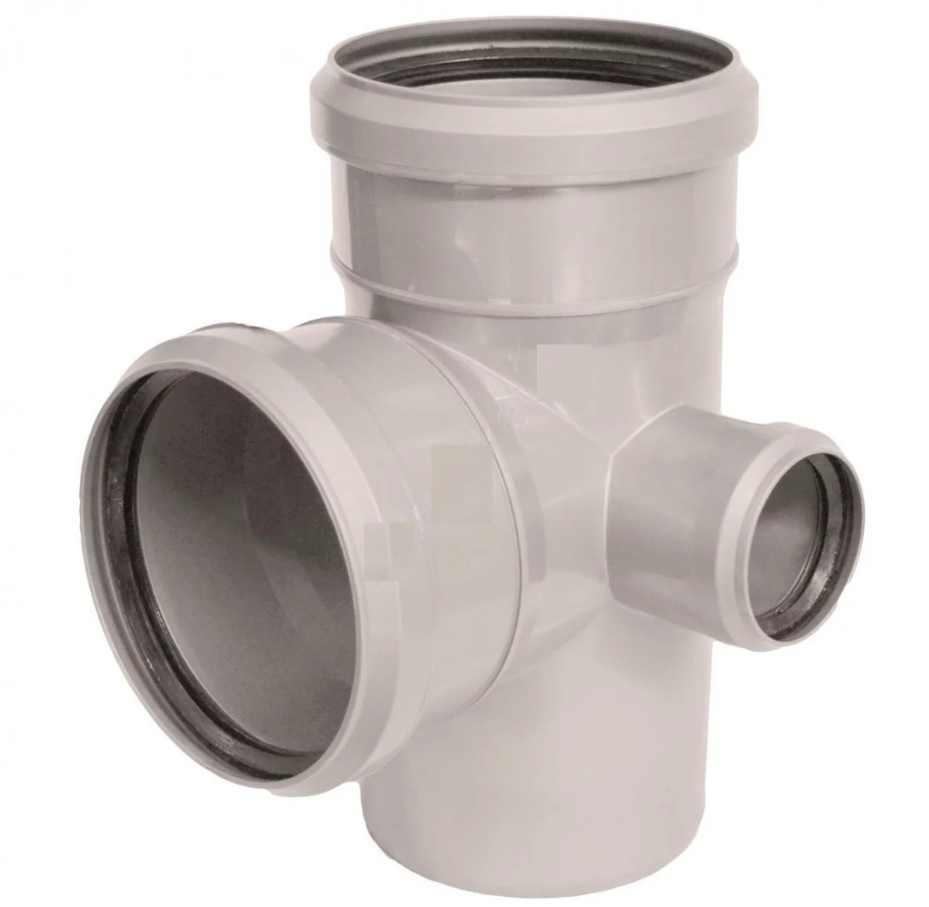 - Прямой тройник (угол 90оС) с раструбами с двух сторон, в канавки которых вставлены кольца уплотнительные. В раструб ответвления вставляется труба меньшего диаметра. Прямая часть тройника вставляется в раструб соединяемой трубы.