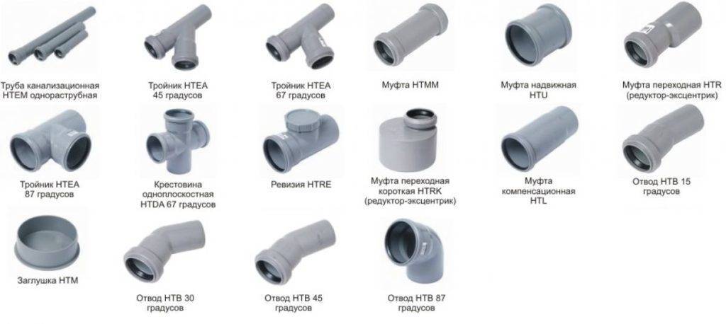Фитинги для канализационных труб ПВХ выпускаются в соответствии с действующими размерами труб. Их конструкция позволяет изменить направление, соединить линии встык или сделать ответвление канала. В продаже имеются:
