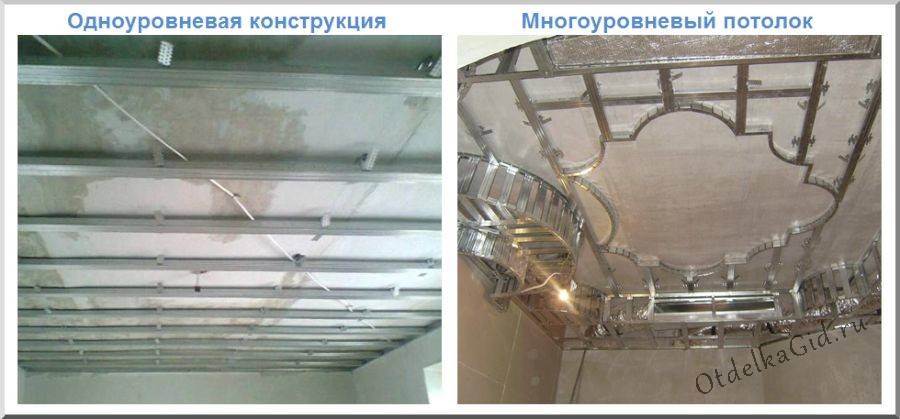 - Многоуровневые (в этом случае каркас монтируется таким образом, чтобы плоскости для обшивки гипсокартоном были на разных уровнях).