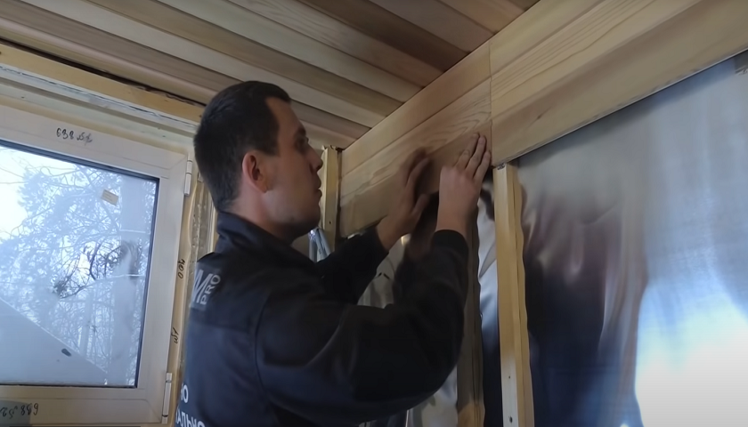 Крепите при этом цельные листы внахлест, проклеивая все края скотчем – важно тщательно проделать эту операцию, чтобы в бане не возникала ненужная влага