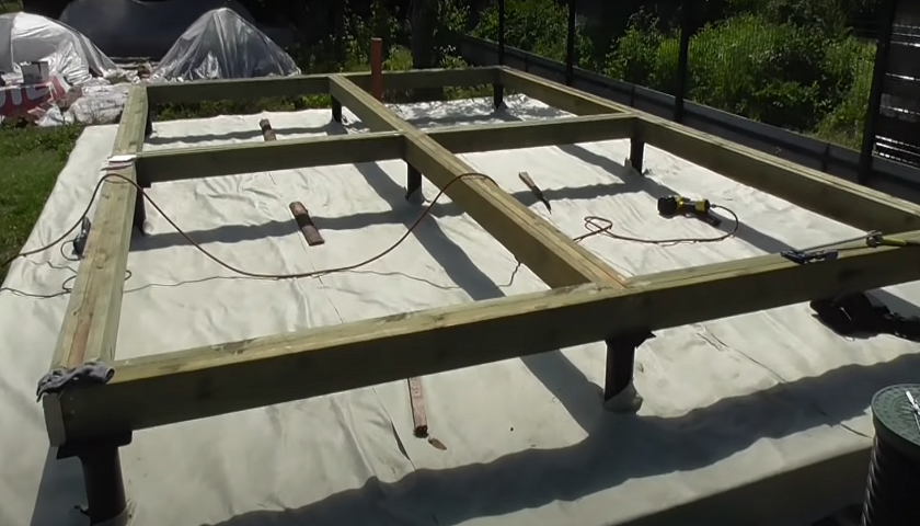 - На них укладываются доски чернового пола и укрываются слоем гидроизоляции и ветрозащиты. Это поможет защитить пол от воздействия природных явлений и образования конденсата в его слоях;