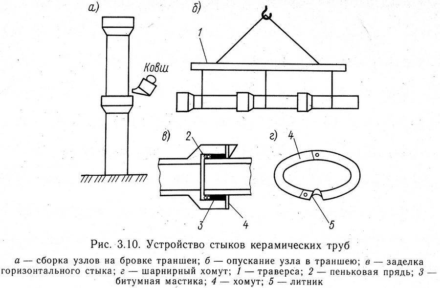 Особое внимание уделяют герметизации стыков. Для прямых изделий используют муфтовые узлы. Для раструбных – обязательна заделка полости битумными, глиняными, асбестоцементными, цементными растворами, асфальтовой мастикой