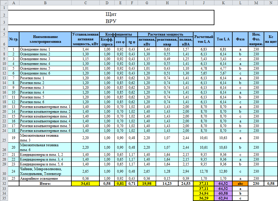 Расчет коэффициента спроса розеточной сети выполняют в соответствии с п.6.16 СП 31-110-2003 и Таблице 6.6. Получаем Кс роз. = 0,2.