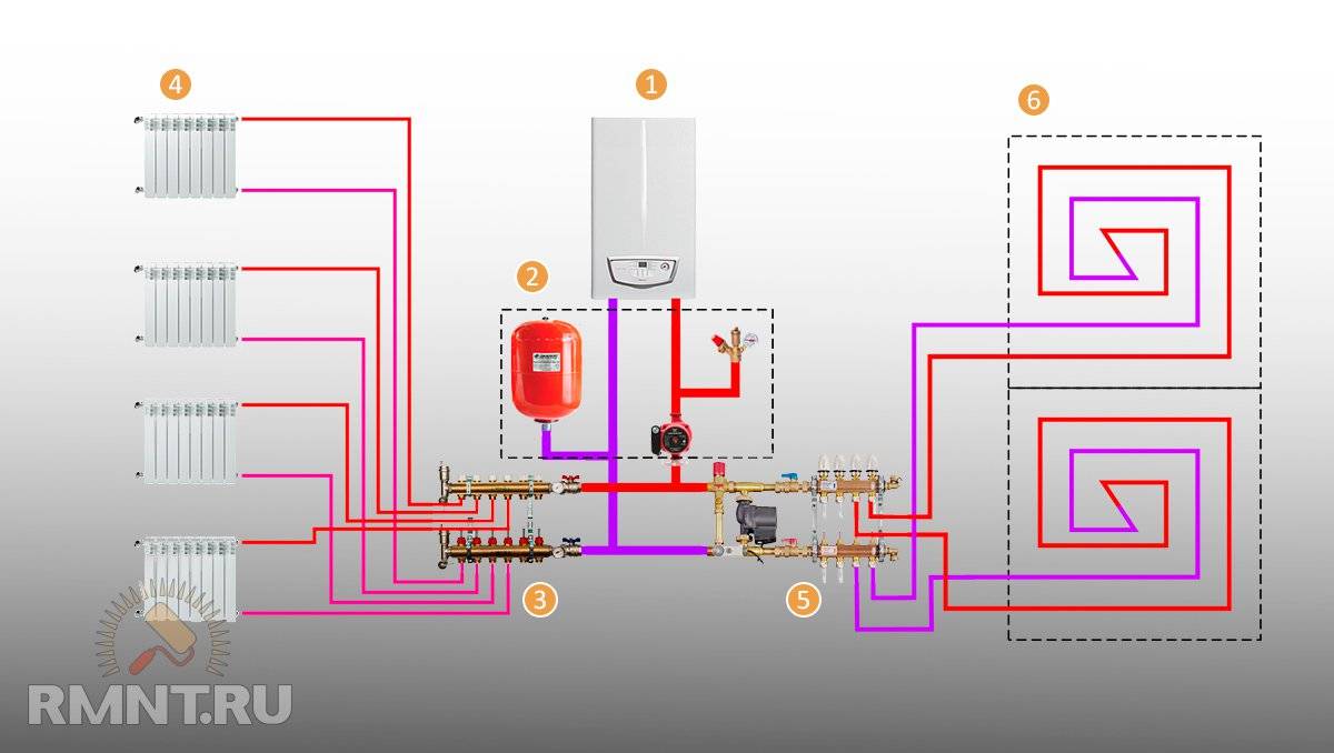 Типовая схема комбинированной системы отопления с подключением радиаторов и контуров тёплого пола. Это наиболее технологичный и легко настраиваемый вариант, но при этом требующий значительных начальных вложений. 1 — котёл отопления; 2 — группа безопасности, циркуляционный насос, расширительный бак; 3 — коллектор для раздельного двухтрубного подключения радиаторов по схеме «звезда»; 4 — радиаторы отопления; 5 — коллектор тёплого пола, включает в себя: байпас, трёхходовой клапан, термостатическую головку, циркуляционный насос, гребёнки для подключения контуров теплого пола с редукторами и расходомерами; 6 — контуры тёплого пола