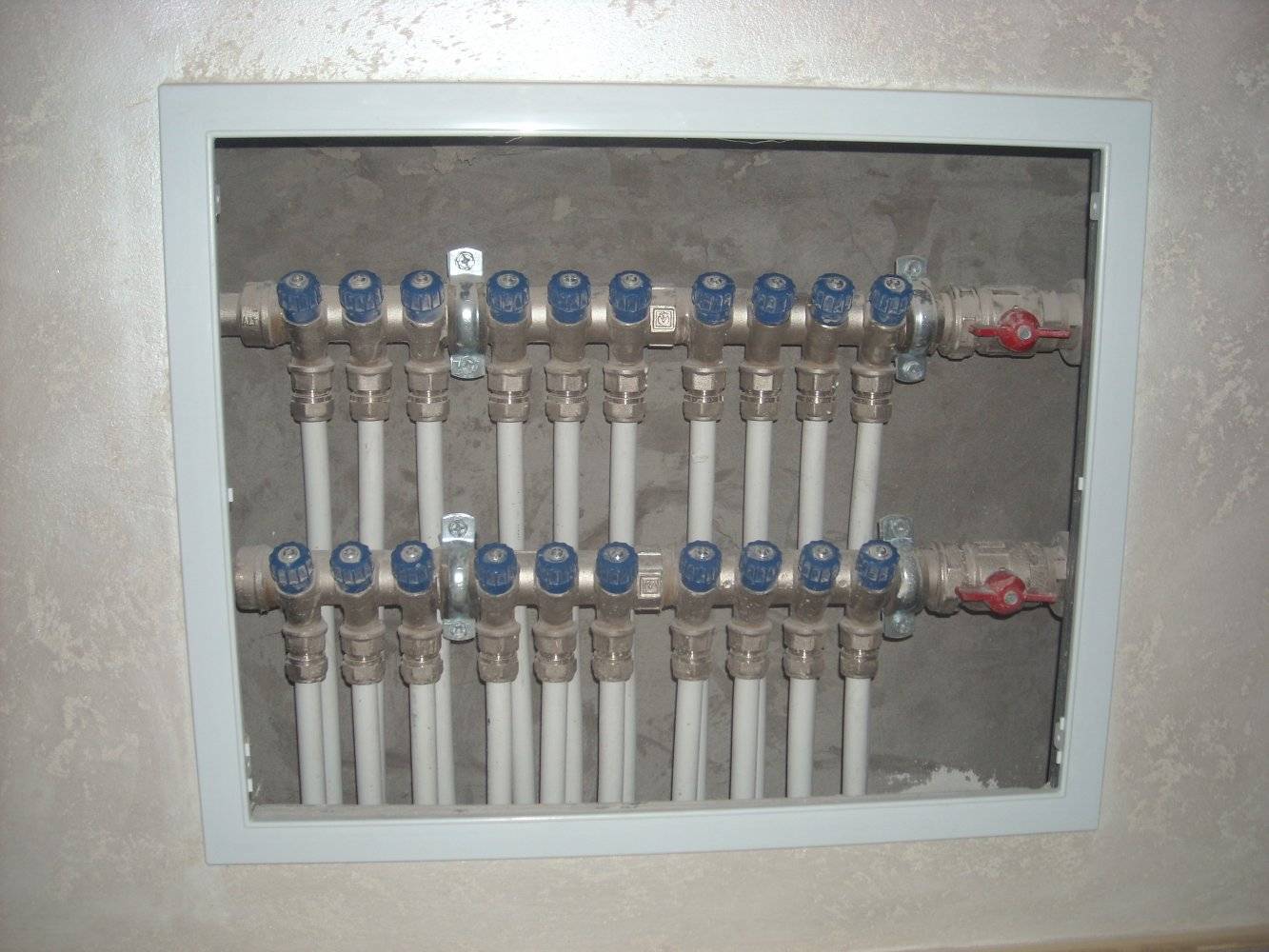 В помещении подбирают место для установления шкафа, и для коллекций труб напольного перекрытия, они должны иметь примерно одинаковую длину – 70 см. Коллектор скрывают в шкафу, который обладает металлическим коробом (или из крепкого пластика), его прикрепляют к стене в углубление. В середине имеются вертикальные планки, устанавливающие по ширине главного устройства. На нем производится подключение контуров и других элементов теплоснабжения помещения, монтируется дополнительное оборудование.