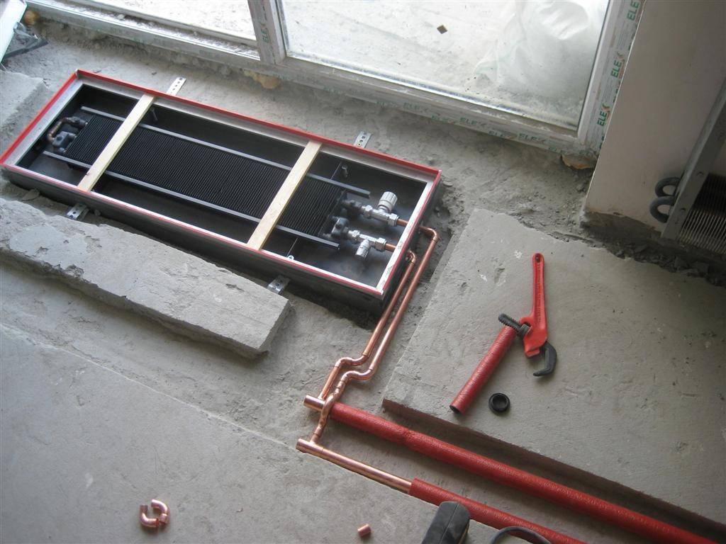 - Во внутрипольном – такие конвекторы лучше всего справляются с предотвращением оседания конденсата на панорамных окнах.