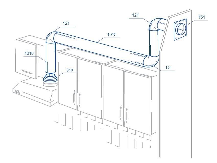 Для установки среди различных углов, поворотов и других особенностей кухни, производители предусмотрели кроме основного воздуховода (трубы), множество дополнительных деталей, позволяющих маневрировать при монтаже короба.