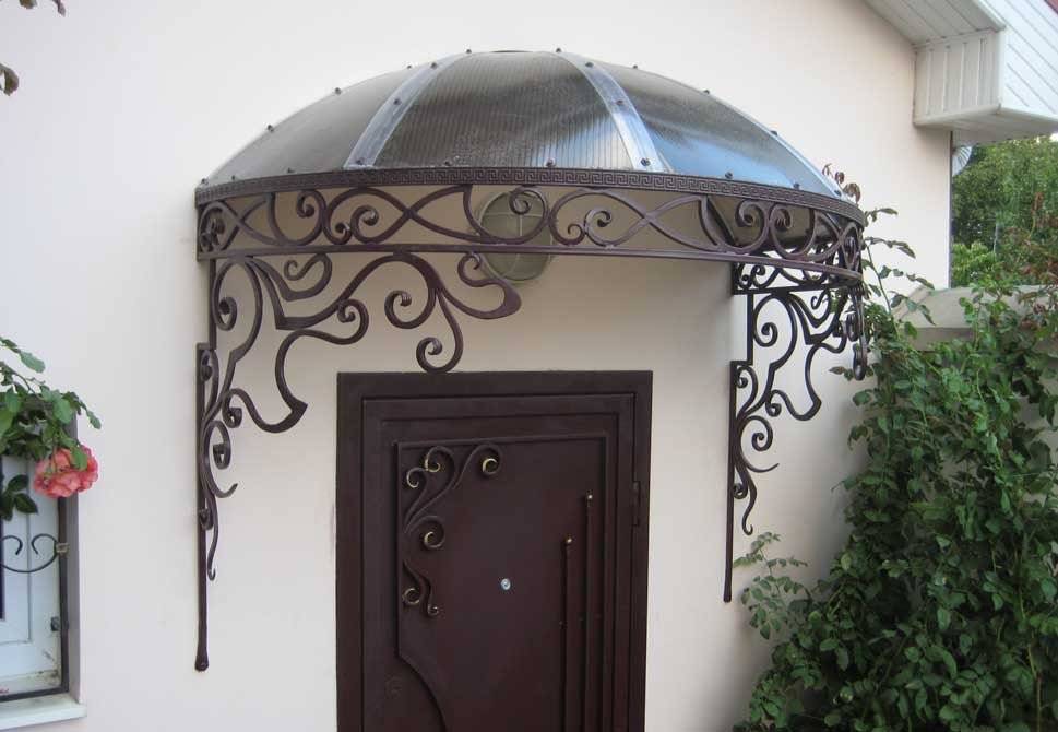 Козырьки выполняются различными по форме, его длина делается не менее 85-100 сантиметров, ширина должна превышать размеры дверного проема на 40-60 см. В качестве дополнительной защиты от погодных явлений, конструкция оснащается боковыми стенками.