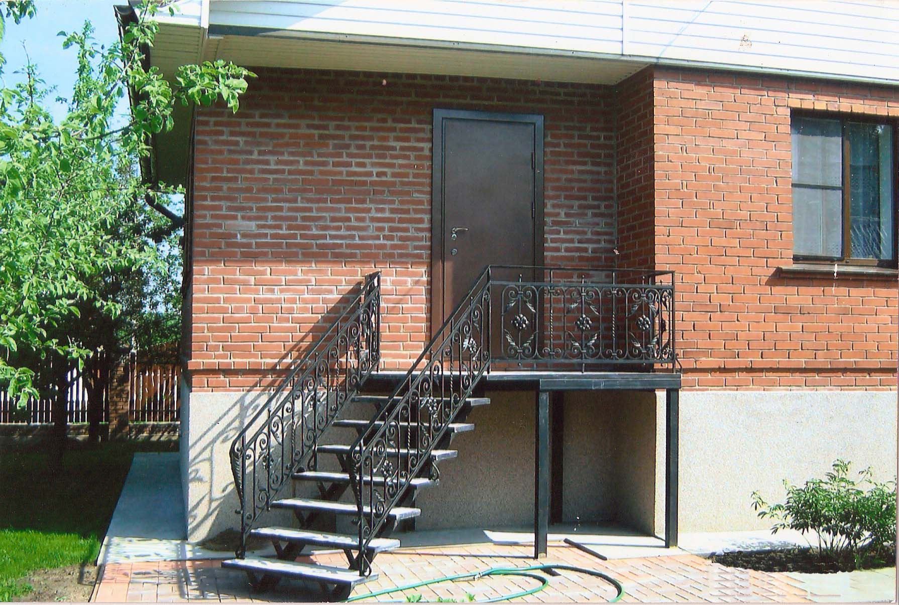 Вход в здание, оформленный блестящими либо черными коваными или листовыми элементами, смотрится шикарно, дорого. Такой вариант подойдет для многих дизайнерских стилей, оригинально сочетаясь с кирпичными, бетонными, деревянными постройками. Но имеется ряд недостатков: лестница выходит очень скользкой во время зимы, дождь, ударяясь об нее, чрезмерно громко шумит, покрытие постоянно нуждается в антикоррозийном покрытии, которое периодически придется обновлять.