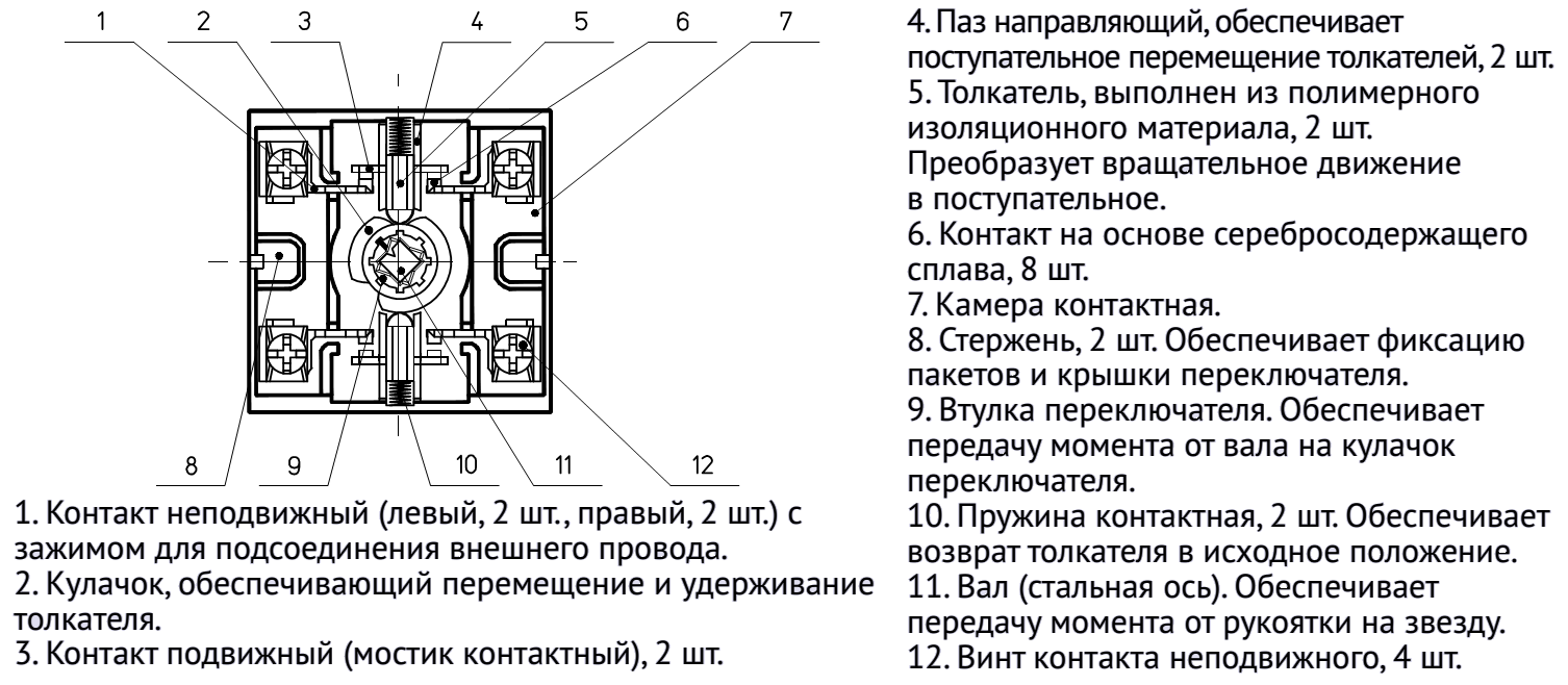 Кулачковые переключатели состоят из нескольких пакетов (каждый из которых отвечает за коммутацию одной линии), помещенных в один корпус. На нижнем рисунке показано устройство такого пакета.