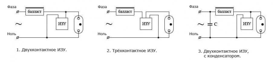 Заметьте, есть ИЗУ двухконтактные и трехконтактные. Первые подключаются параллельно самой лампе.