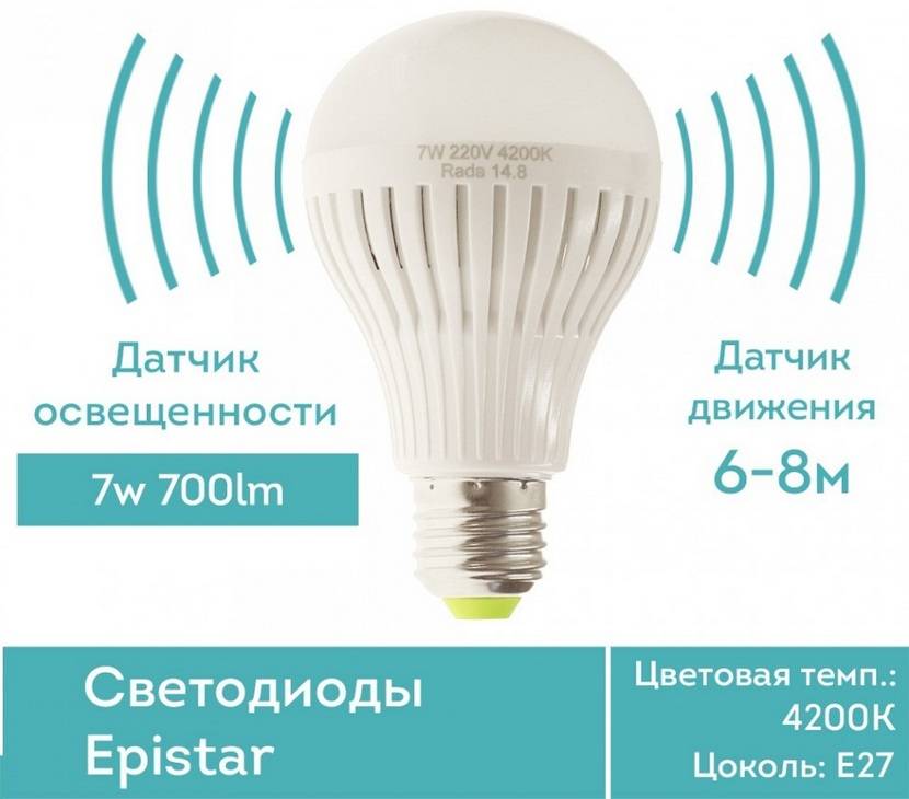 В отличие от устройств с внешним узлом автоматики, светодиодные лампы оснащаются встроенными детекторами. Компактность конструкции дает возможность установки в обычный патрон типа E27. Светильник с датчиком дает холодный белый свет. Мощность светодиодной лампы может быть в 5–10 раз меньше в сравнении с лампочкой накаливания, и это не сказывается на интенсивности свечения.