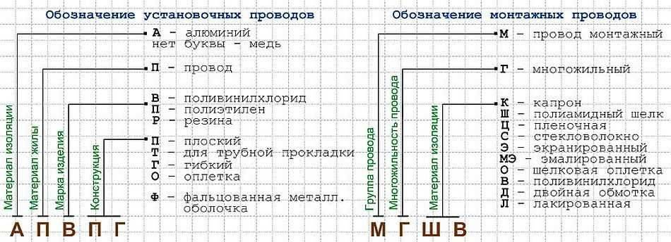 Обозначение проводов производится по аналогичной схеме, что и кабелей. Имеется буквенная часть обозначений: