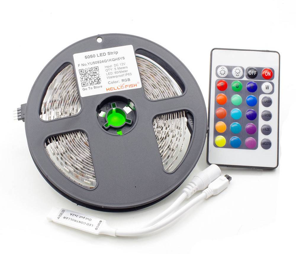 Светодиодная лента обычно поставляется намотанной на катушки отрезками длиной пять метров с припаянными на внешнем конце короткими проводами, как на фотографии.
