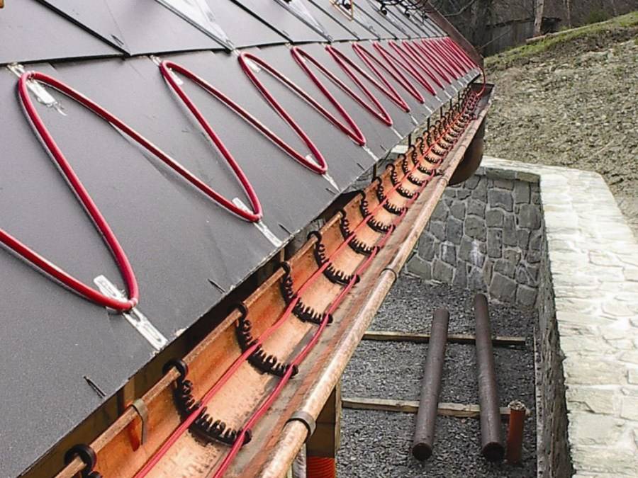 При обустройстве системы обогрева в ендове не возникают трудности. Нагревательный кабель размещается вдоль желоба. В качестве крепежных элементов используются клипсы или хомуты.