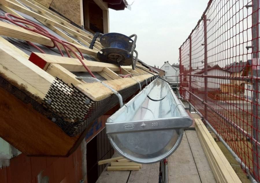 Выполняется монтаж, когда настил кровли завершен. Минимизируется риск повреждения материала. Также дополнительные кронштейны потребуются, если основные кронштейны для крепежа желобов оказались короткими.