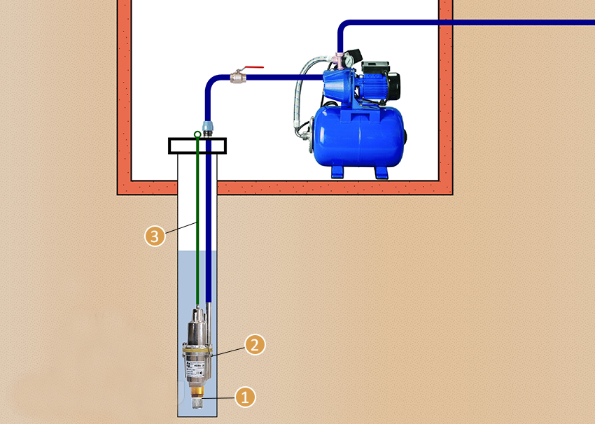 1 — обратный клапан с фильтром; 2 — погружной насос; 3 — трос