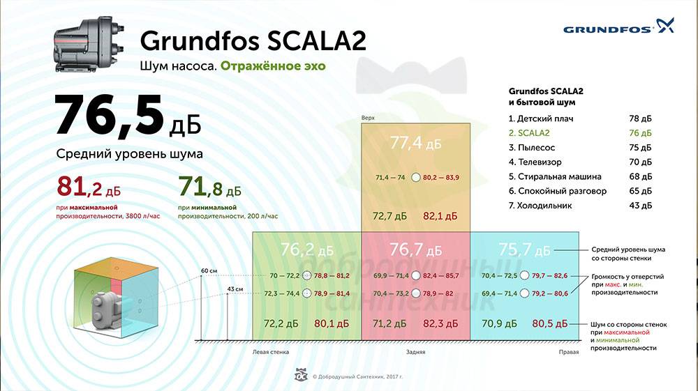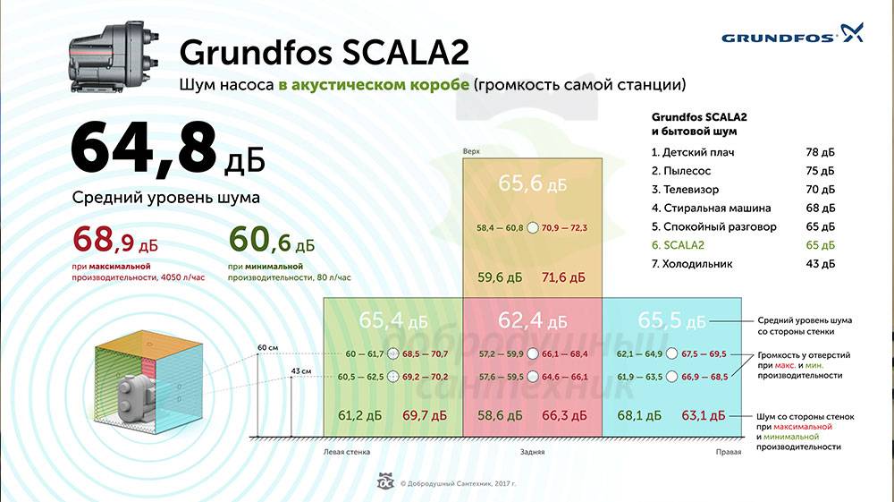 Благодаря встроенным элементам, насосная установка Scala2 регулирует в автоматическом режиме свою работу, адаптируется к параметрам расхода в системе водоснабжения. Перекачиваемая жидкость выступает в качестве охладителя электродвигателя. Это и позволяет генерировать самый низкий уровень шума.