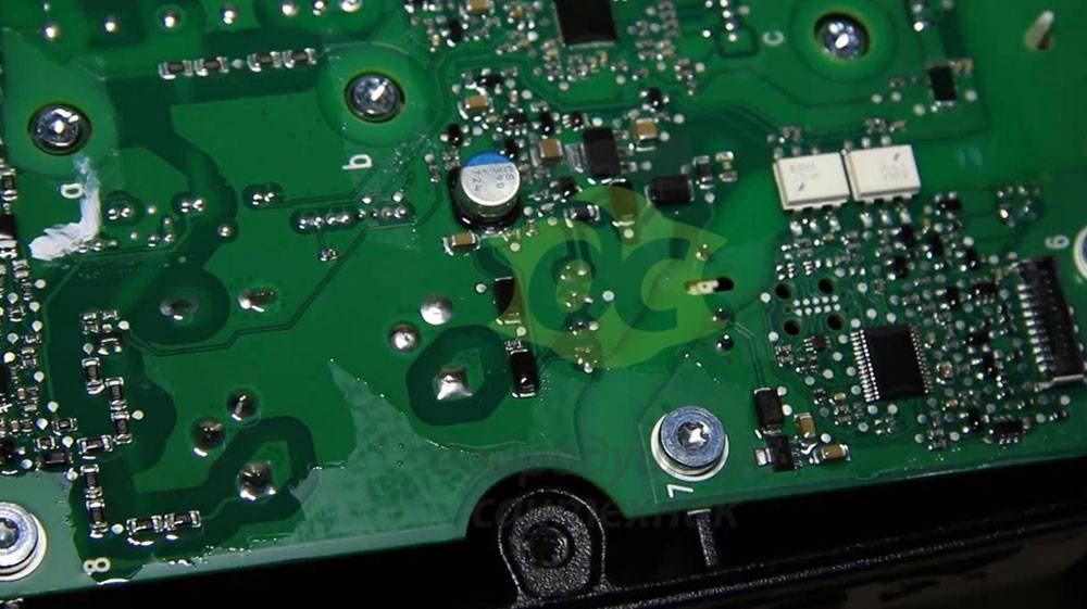 а на плате нанесен ещё какой-то полимер, который скрывает почти все электронные компоненты. Т.е. если влага как-то и проникнет внутрь устройства, то электроника ещё будет жить.