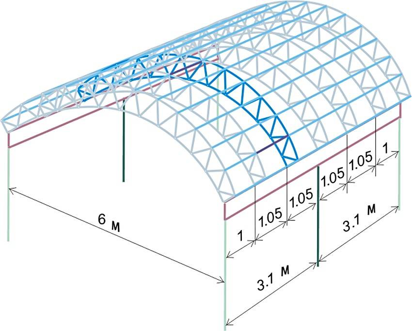 - Фермы свариваются на земле. В готовом виде элемент поднимается и приваривается к продольным трубам. Между фермами устанавливают продольные перемычки с дистанцией в 50 см.