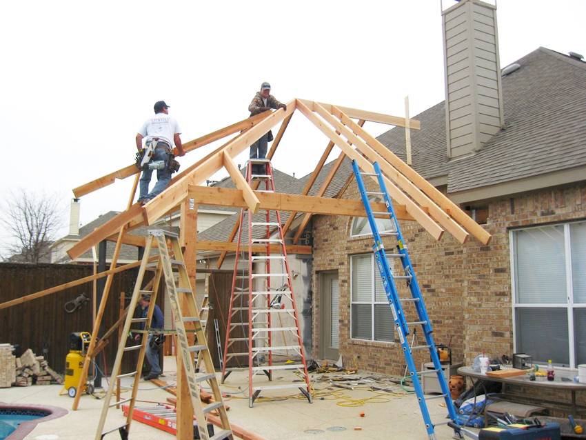 Когда с обустройством пола покончено, приступают к сборке основных элементов веранды, то есть стен и крыши.