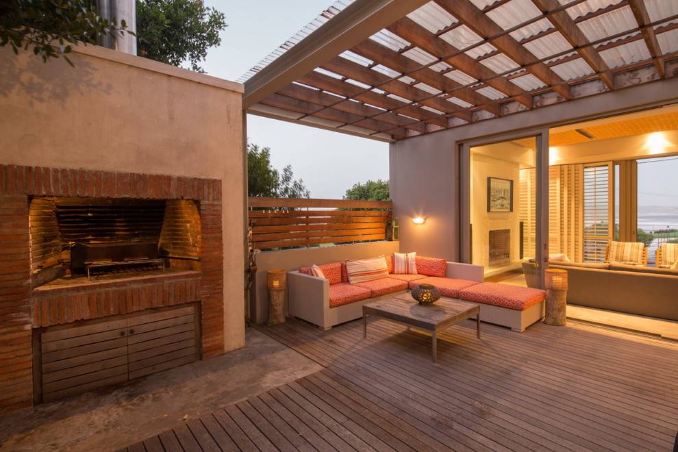 Терраса, накрытая поликарбонатом, обычно располагается спереди либо сбоку от дома, а также в отдельно стоящей конструкции. Построить такое сооружение допустимо, даже если на площадке под крышей планируется разместить не только стол и стулья, но и мангал, барбекю. Если крыша тонированная, под ней не жарко солнечным летом, а во время дождя можно наблюдать за его стекающими каплями. Террасу делают открытой, частично либо полностью защищенной стенками.