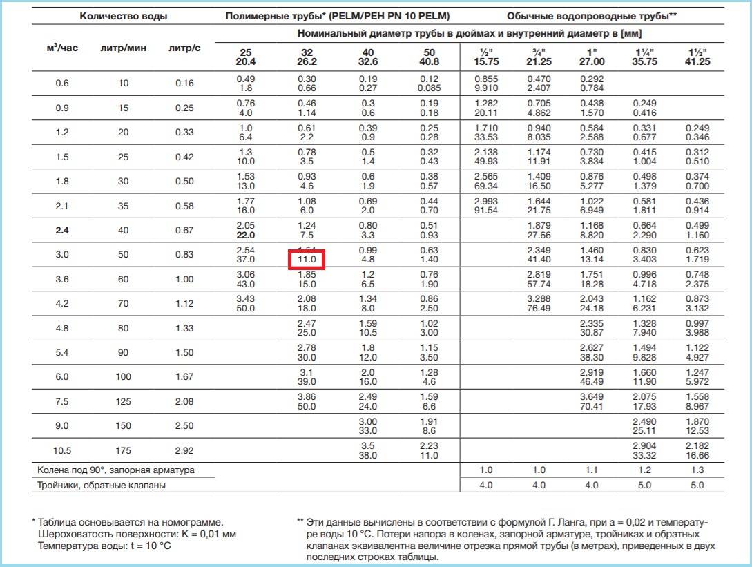 В колонках указаны два ряда цифр, нас интересует только нижний показатель с обозначением потерь на 100 метровом участке трубопровода (данные приведены в метрах). Для более точных расчетов в таблице указаны потери в коленах, запорной арматуре, тройниках, обратных клапанах (нужный параметр также указан в метрах).