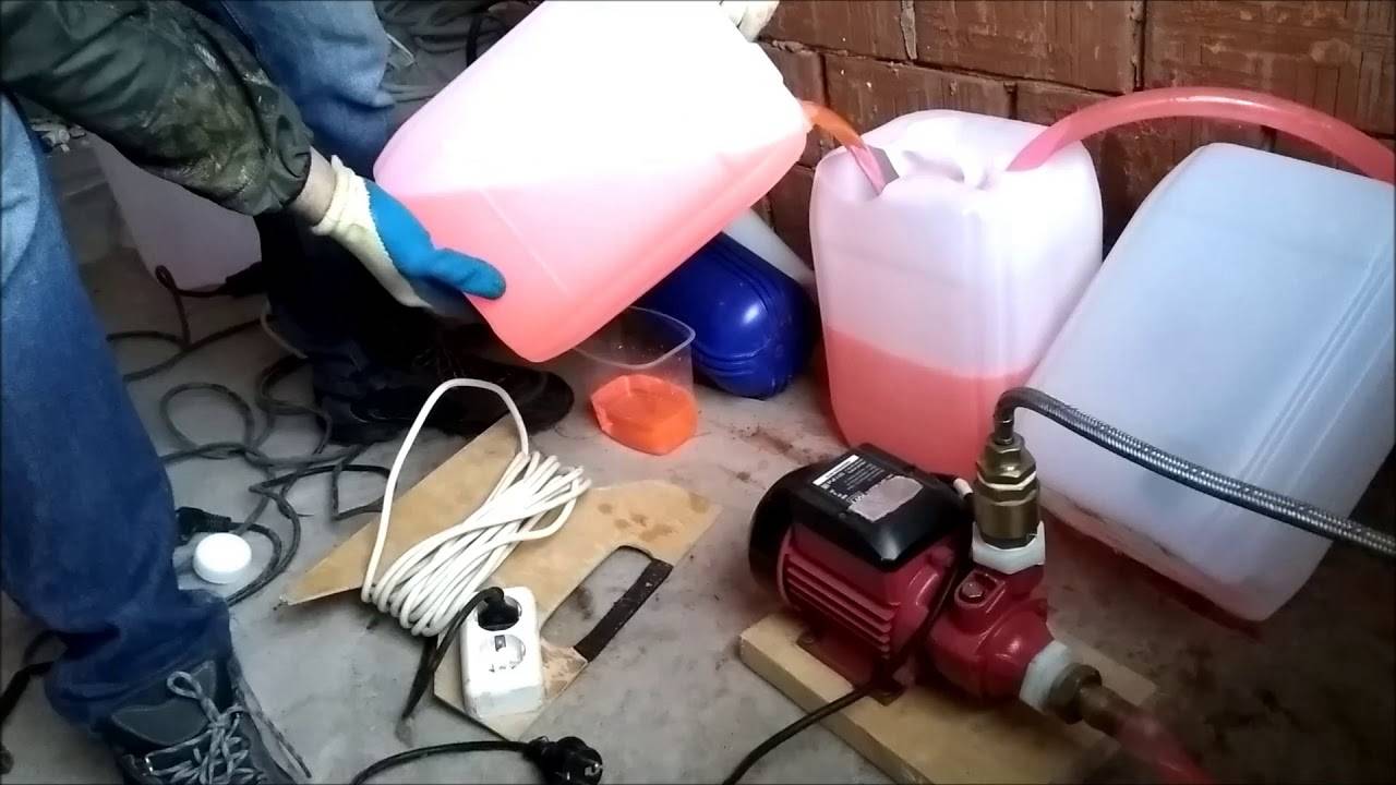 Если вы эксплуатируете установку с принудительной циркуляцией. то теплоноситель необходимо подавать под давлением, при помощи насоса с нижним забором воды. Подсоединить к нему и хорошо закрепить на стыках прочный шланг. Опустить его в ёмкость с антифризом и включить насос.