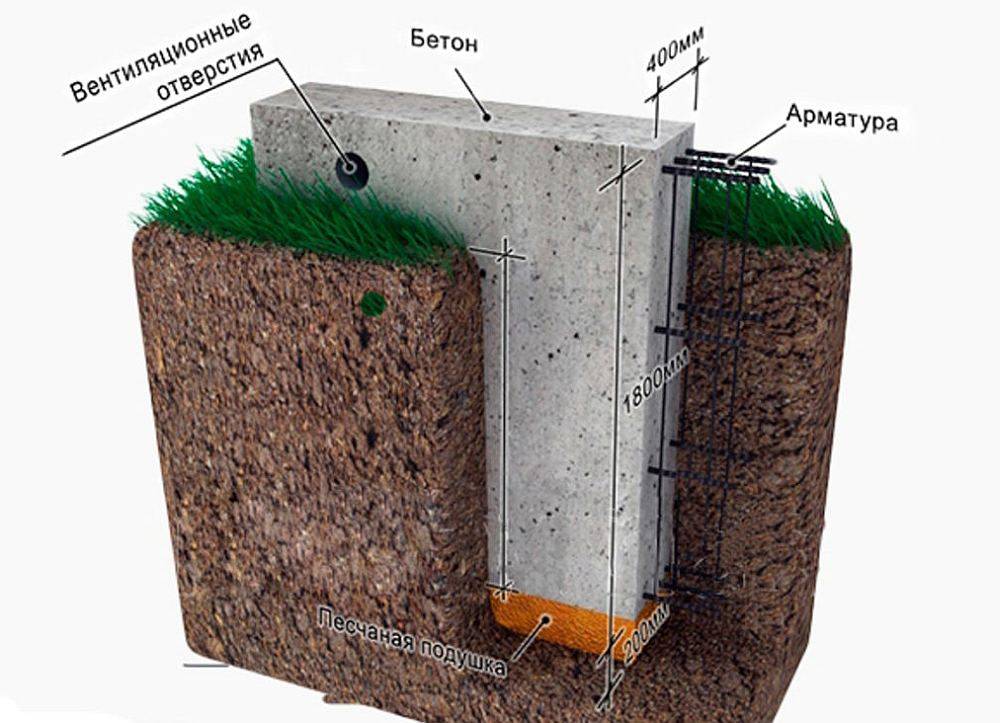 Заглублённый фундамент или фундамент глубокого заложения представляет собой несущую железобетонную или сборную ленту, находящуюся ниже, чем уровень промерзания грунта на 20–30 см.