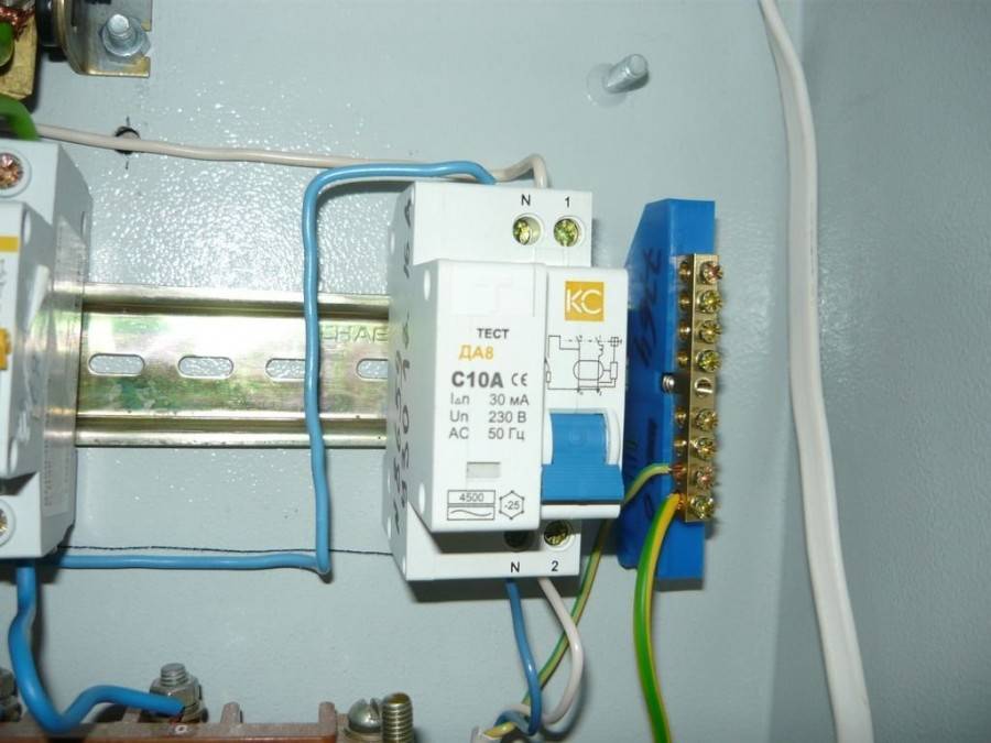 - осуществляется подключение проводника, который идет из прибора защитного отключения к одному из зажимных болтов, расположенных в нулевой шине;