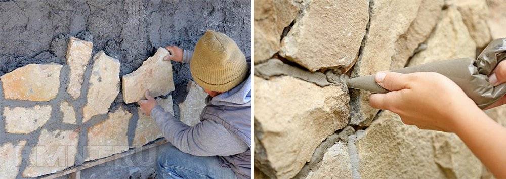 Тяжелый природный камень наклеивается поверх сетки таким образом, чтобы клеевая смесь сцеплялась одновременно с сеткой и поверхностью фундамента. Перед укладкой камня промежуток между сеткой и цоколем можно заполнить цементной смесью.
