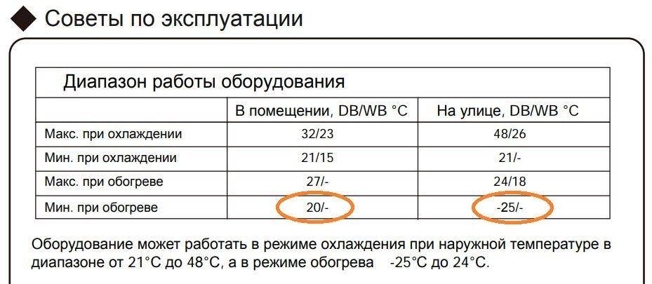 Все производители указывают минимальную рабочую температуру в зимний период (см. рис). Но вы вряд ли знаете, что она отличается от пусковой. Старт кондиционера должен происходить при более высокой температуре.