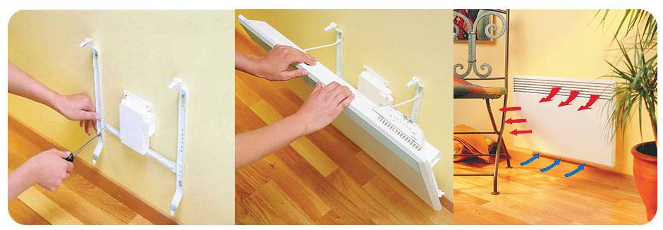 После покупки конвектор необходимо закрепить. В случае с настенными моделями сначала к стене крепится рама устройства, если же конвектор напольный, необходимо зафиксировать на корпусе ножки с колесиками. К каждой модели прилагается инструкция по установке устройства.
