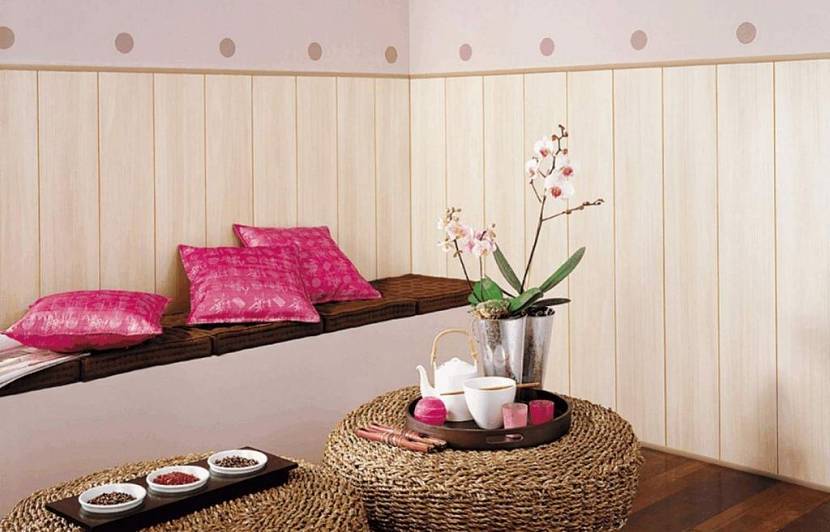 Самый дешевый способ отделки помещения. Любой строительный магазин может предложить огромный выбор подобных отделочных материалов. Яркие, с разными рисунками, имитирующие дерево и однотонные, они не бояться сырости. Ими часто отделывают кухни и ванные комнаты. Значительно улучшилось и качество ПВХ панелей предлагаемых потребителю. Сегодня они не выгорают, при изготовлении используется более качественный пластик. При выборе лучше отдать предпочтение российским или европейским производителям.