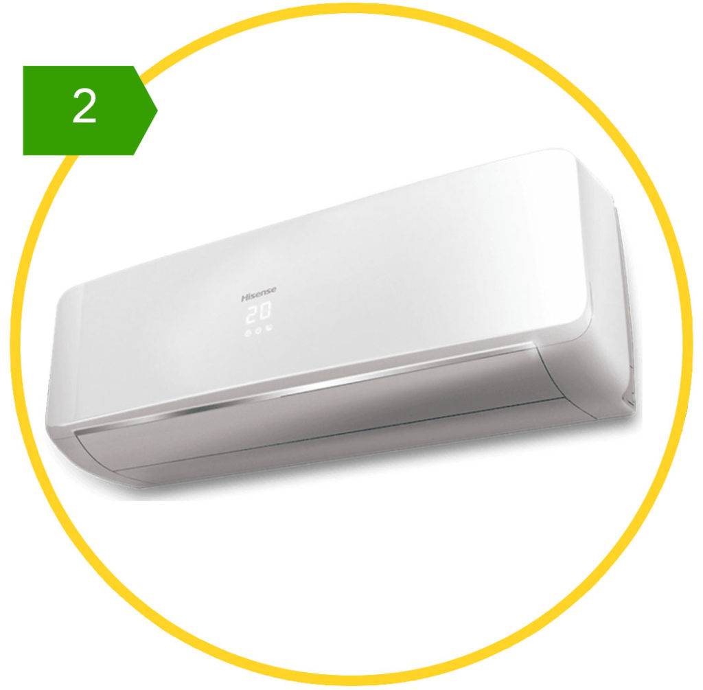 Рекомендуемое решение для помещений небольшой площади. Внешний модуль с шумными составляющими будет на улице, внутренний – в комнате на стене под потолком. В зависимости от потребностей, внутренних блоков, подведенных к наружному, может быть как один, так и несколько.